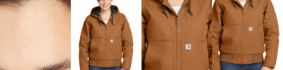 This ladies version is an update to a Carhartt icon-the WJ130. Tough on the outside and warm on the inside, it's also sanded and brushed for softness. 12-ounce, 100% ring spun cotton washed duck Quilted nylon lining for easy on and off; 80-gram, 100% polyester 3M Thinsulate featherless insulation for warmth without the weight Attached quilted-flannel-lined three-piece hood with drawcord closure Full-length brass front zipper Two interior pockets: one zippered, one hook and loop Two large hand pockets Pen stall in right pocket Locker loop Elbow pleats for ease of movement Rib knit cuffs and waistband Carhartt-strong, triple-stitched main seams Carhartt label sewn on left pocket Loose fit